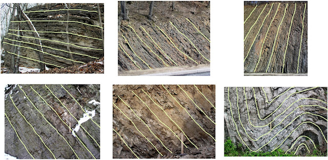 A přikládám k nim i vlastní zákresy. Samozřejmě, že cílem není zakreslit každou vrstvu, ale naznačit obecný směr průběhu vrstev či jejich deformaci na fotografii: